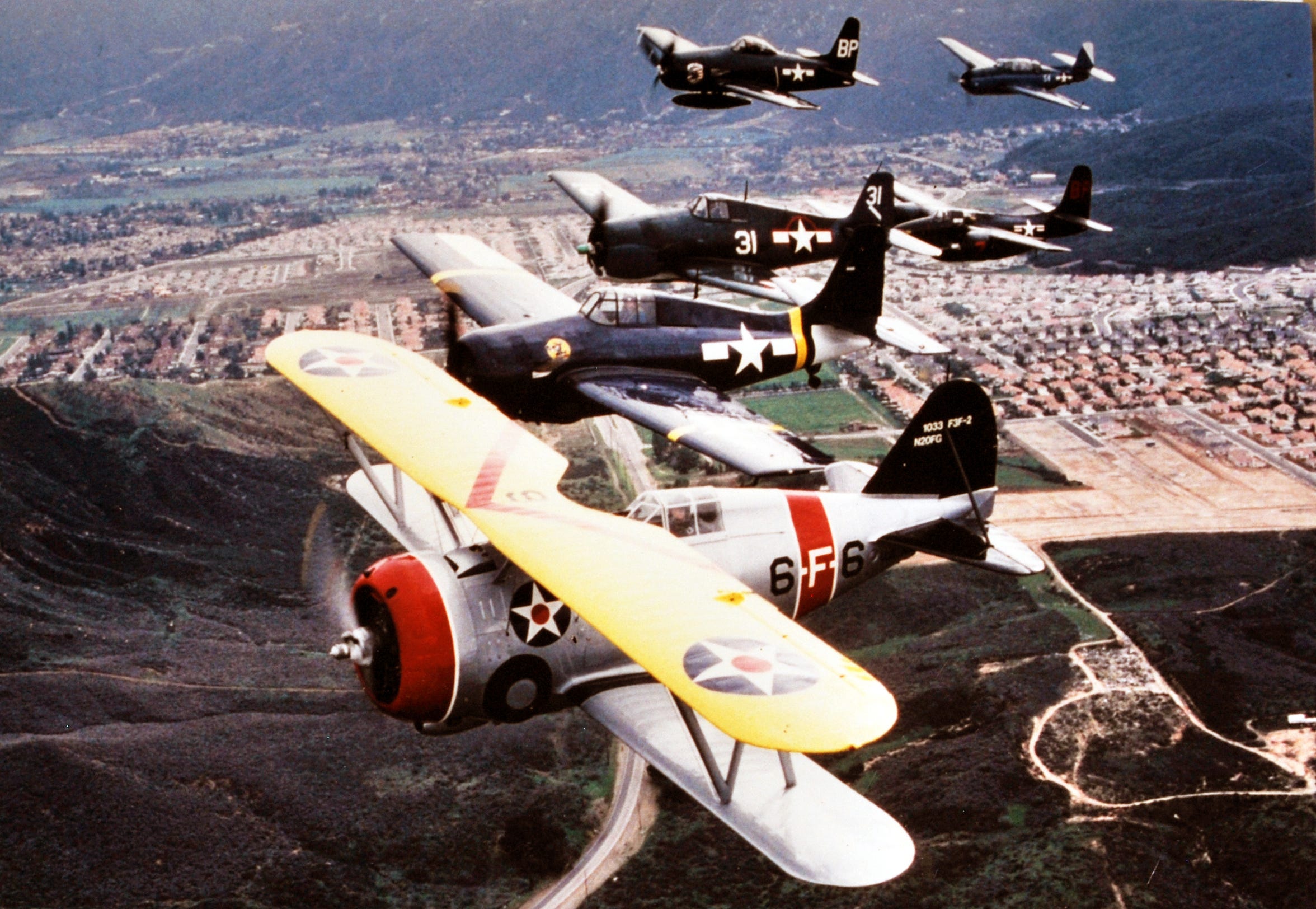 This was the “Cat Flight” flown in February 1997. It is every piston-engined carrier airplane Grumman ever made, all together. From nearest to farthest, it’s an F3F-2 “Flying Barrel”, an FM-2 Wildcat, an F6F-3 Hellcat, an F7F-3 Tigercat, an F8F-2 Bearcat, and tail-end charlie is a TBF Avenger torpedo bomber.