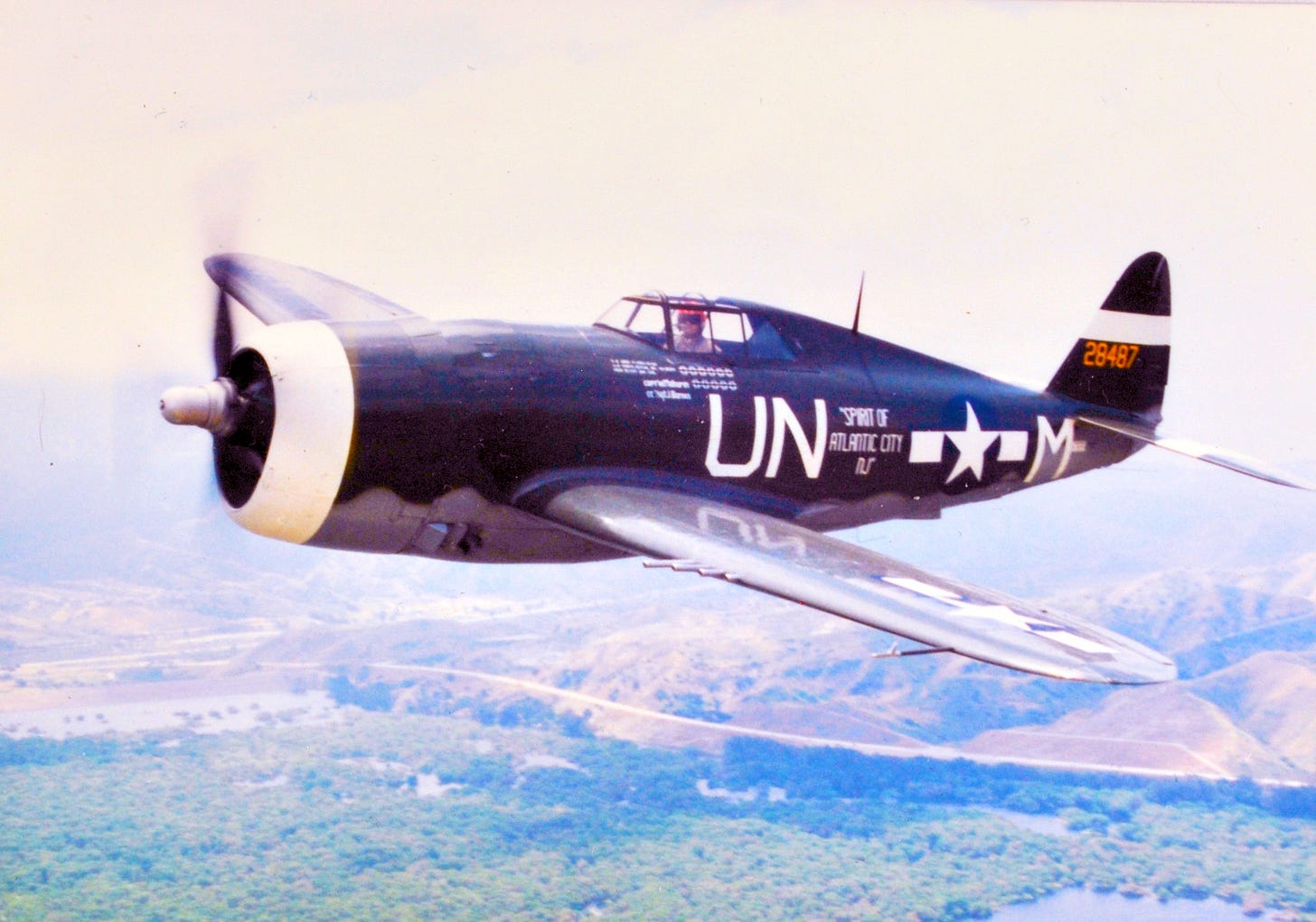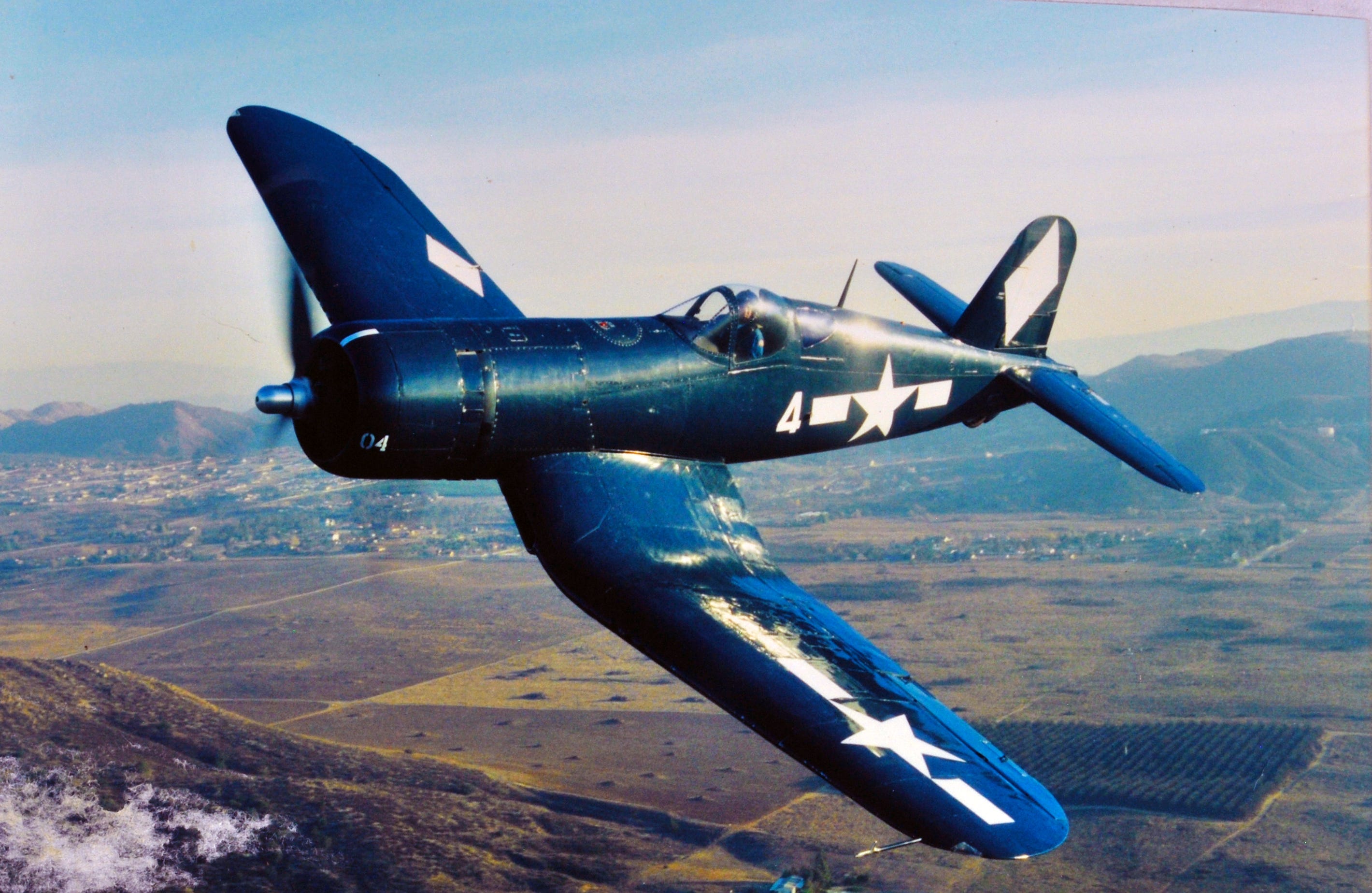 This is the Museum’s F4U-1 Corsair, which was one of the first airplanes restored to flight status by Planes of Fame.