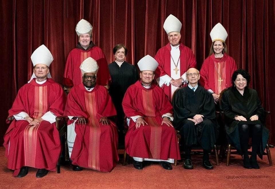 I do Love this picture!!!! I am a practicing Catholic! These miter-clad justices have aligned with the 50% of US Catholic Bishops who jumped into bed with the far right conservative and partisan political machine. I say 50% because though that number is vocal--the "excommunicators" I call them-- there are other Bishops who are staying silent for various reasons, good and bad.