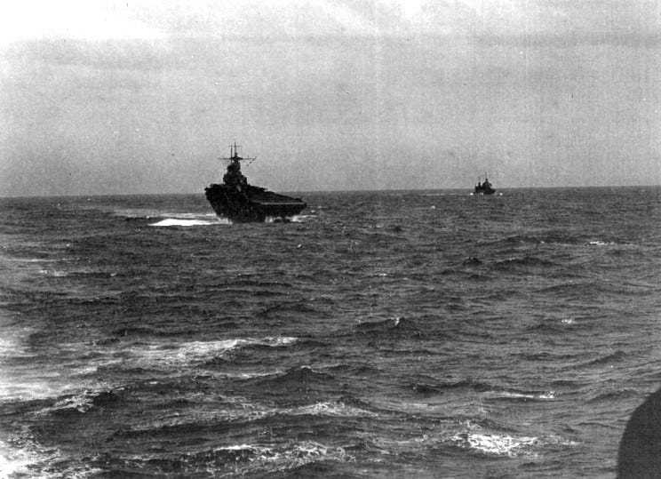 John Bridgers recalled the voyage westward. “The Enterprise was along to provide scouting, anti-submarine and air defense for the force. My days were marked by tedium. The flight deck was kept ready with a coterie of planes, prepared for a deck-load launch at any time. Aircraft were launched repeatedly throughout the day with search and patrol flights kept airborne from sun up to sun down; one flight was launched and then the one in the air brought aboard every four hours. This necessitated taxying all the unused planes forward to clear the landing area. When the pilots manned their plane for this 15-minute exercise, they had to go with up-to-date navigational material, prepared to immediately launch rather than taxi if enemy contact occurred during this brief but critical time. LCDR Max Leslie was the skipper of Bombing Three and I was his ‘taxi’ pilot. I sat in the Ready Room most of the day, reworking my chart board every four hours or so and then taxied the skipper's plane forward. I was not allowed to fly on any of the patrol missions because I had not yet been carrier qualified in the SBD and Admiral Halsey, the task force commander, said he could not risk a plane for this purpose before our mission was complete. I wasn't unhappy that I had been brought along, but I couldn't exactly figure why that was. “