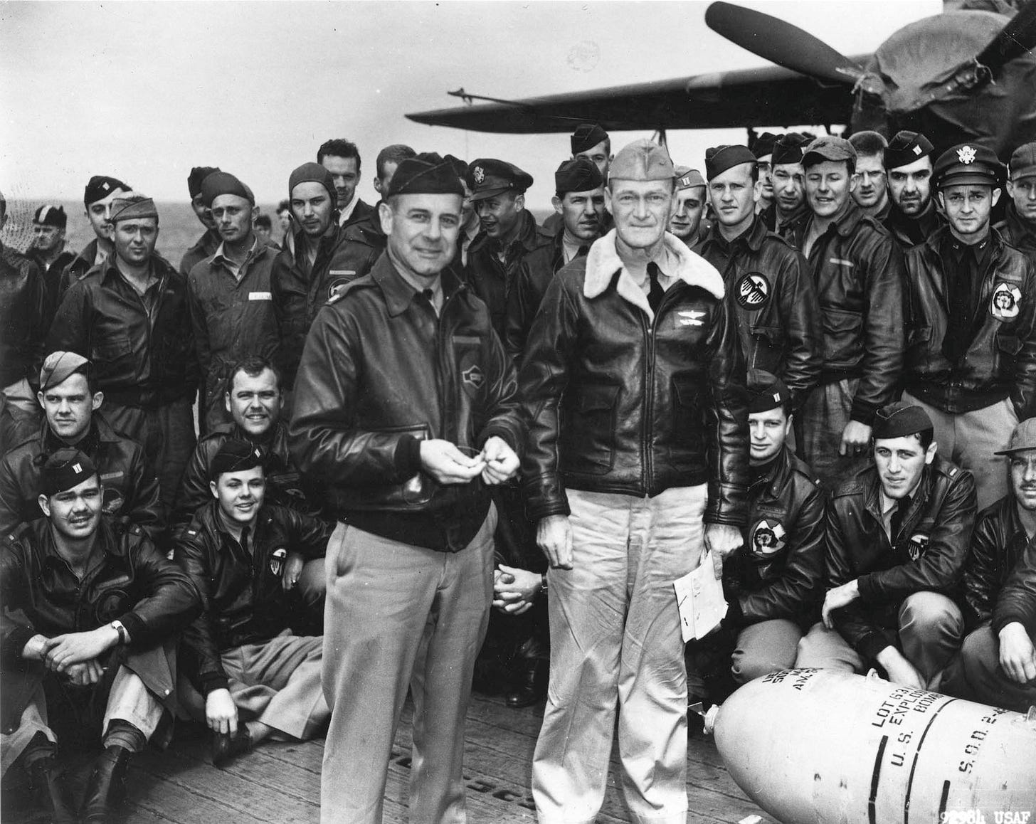 Jimmy Doolittle (l) and Hornet CO Marc Mitscher with the Raiders before takeoff
