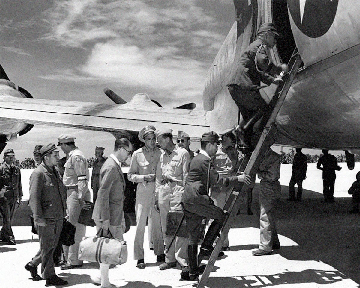 At the airfield, aircrews and ground crews of the resident USAAF units, and any other Americans who could arrange to get there waited for the arrival of the four aircraft. As if putting on a show for the victors, the two Betty bombers made a low pass over the runway before landing. Once on the ground, American military police quickly established a perimeter around the aircraft and the Japanese government representatives were quickly escorted to a waiting C-54 transport for the flight to Manila where they would meet with General Douglas MacArthur and the other representatives of the victorious Allies to work out the concrete details of the surrender of the Empire of Japan