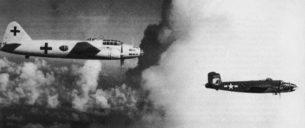 The Pacific War had ended ten days earlier, but the crews were on the alert for possible attacks by Japanese who did not heed their Emperor's decision to surrender. This was perhaps the most important rendezvous of the Pacific War as the two bombers from the 345th "Air Apaches" Bomb Group waited to sight the aircraft carrying the official Japanese surrender delegation. Finally, Decker's top turret gunner spotted the white dots to the north. The white dots soon resolved themselves as two G4M1 "Betty" bombers, their camouflaged airframes quickly overpainted in white, the well-known Hinomaru “rising sun” national insignia replaced with green crosses, and four Zeros in similar markings. As the B-25s swung in to escort the Bettys, the Zeros turned away. It was an acknowledgment of their contribution to victory in the Pacific that aircraft of the Air Apaches had been chosen to escort the surrender delegation to the island of Ie Shima, near Okinawa.