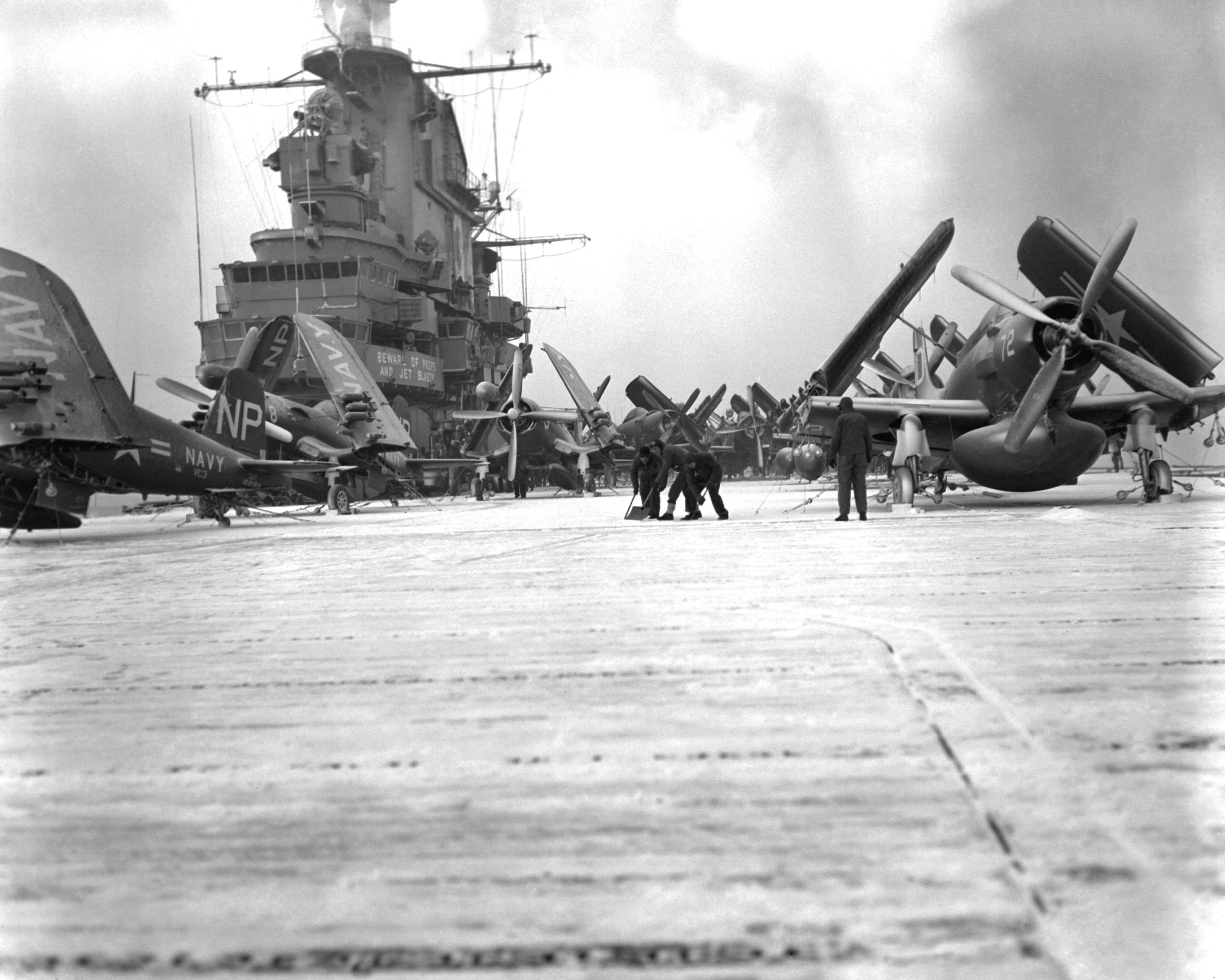 The cloud cover was 500 feet above the freezing Sea of Japan on 18 November 1952. Visibility was estimated at two miles in blowing snow as a Siberian blizzard howled over the pitching, rolling ships of Task Force 77. The weather in the Sea of Japan had been marginal throughout the month of November, with flight operations cancelled on six of the previous 18 days. The fleet was far north of its usual operating position in the Sea of Japan off the east coast of Korea above the Main Line of Resistance, where the carrier air groups had responsibility for the interdiction of enemy movements and resupply over northeastern North Korean supply lines and storage areas, destruction of enemy troops, and air support of naval gunfire.