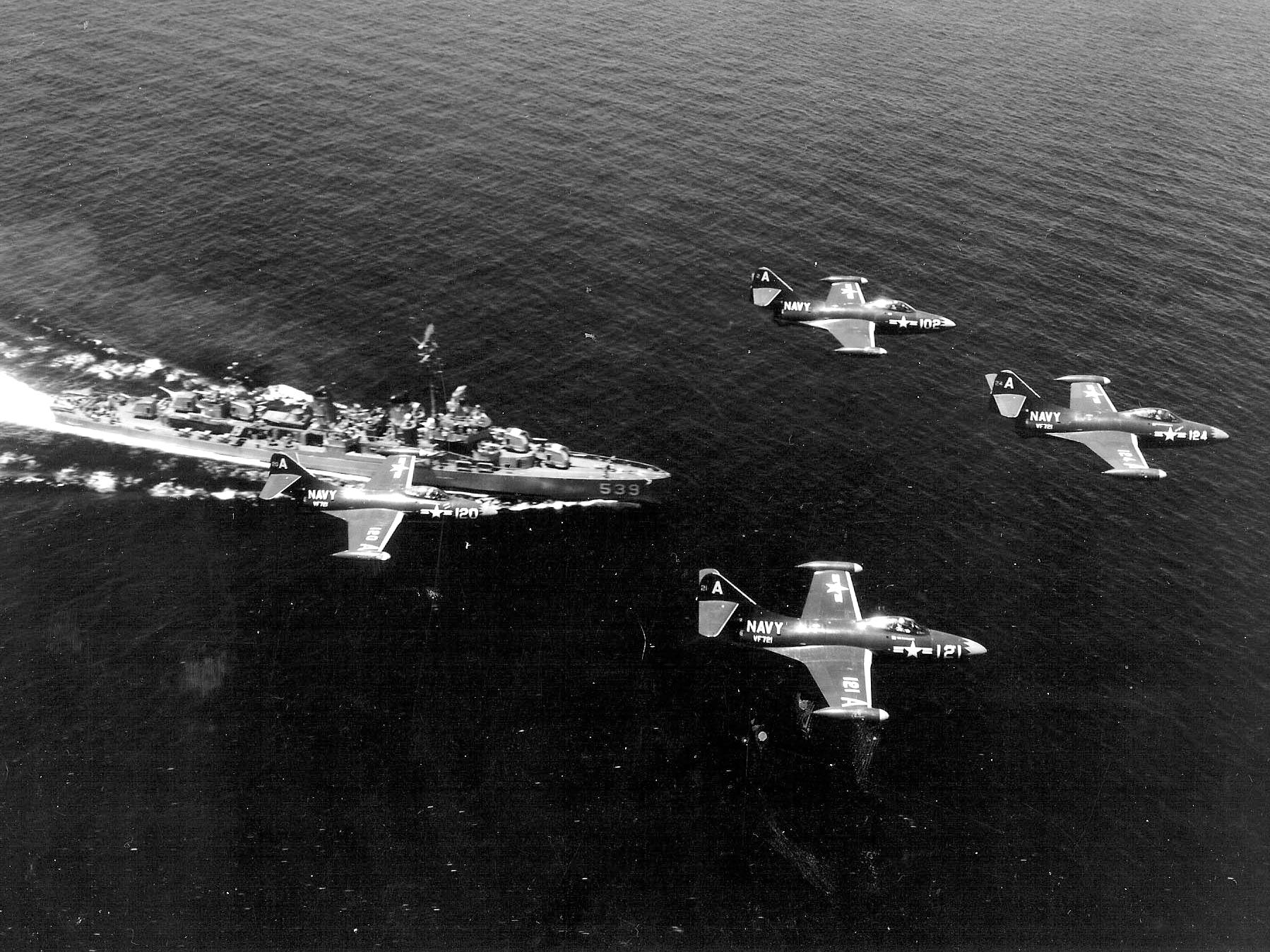 The pilots of the task force were unaware that the heavy cruiser USS Helena (CA-75) was host to a special team of Russian linguists of the new and then-unknown National Security Agency. Their task was to monitor Soviet radio broadcasts, to provide warning of any Soviet response to the American air strikes. At 1340 hours, the linguists in Helena’s radio room intercepted conversations between Soviet ground controllers and a group of Soviet Navy MiG-15s that had just taken off. A minute later, Helena’s radar picked up seven “bogies” climbing through 12,000 feet on a southerly heading. Word was passed to the carriers. Radio warnings went out to the pilots of the Combat Air Patrol in their F9F Panthers patrolling above the clouds over the fleet.