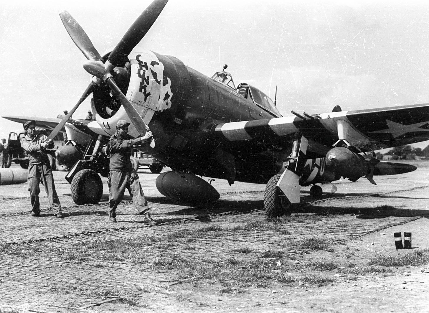 On the taxiway, the big P-47 Thunderbolts, each resplendent in the black and white identification stripes hurriedly applied with mops and brooms by the ground crews two nights before, S-turned under their heavy loads of two 500-lb bombs on the wing shackles and a 110-gallon drop tank on the centerline mount as they taxied toward the runway in the growing dawn light.