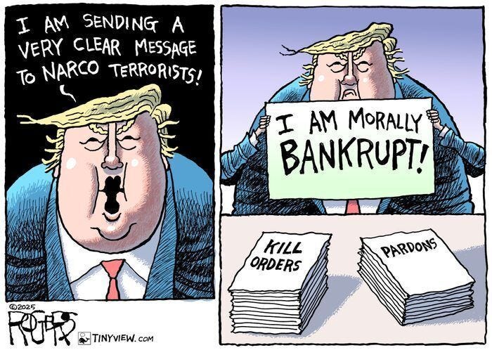 Saturday January 3 was the day the DOJ was to present a report to Congress about why it had made the redactions it did in the Epstein Files. Perhaps a coincidence that Dilbert played “Look! A Shiny Object!” the same day? Ro Khanna and Thomas Massie aren’t buying coincidence and have announced Saturday night that they are bringing “Inherent Contempt” charges against Pam Bondi in the House tomorrow. A statement from Democratic lawmakers on the House Oversight Committeestated: “We are sure it’s just a coincidence, but today is the statutory date for the DOJ to explain its redactions in the Epstein file productions. We have not forgotten, and we won’t let up – regardless of the President’s new unconstitutional actions.” You know there has to be the kind of shit that destroys careers and livelihoods - particularly those of Donald J. Trump in those files, for him to be so desperate to get a new Shiny Object - illegal unconstitutional war - to distract us from them. Nothing else he’s tried has worked and this won’t either.
