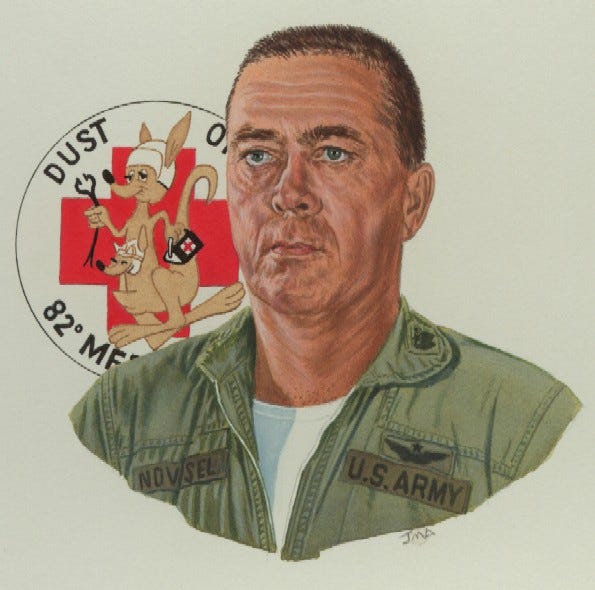 In 1963, Novosel was working as a commercial airline pilot when he decided to return to active military duty. By then, he was 41 and the Air Force did not have space for any more officers in the upper ranks. He made the decision to give up his rank of lieutenant colonel in the Air Force to join the Army and fly helicopters as a chief warrant officer (CW4) with the elite Special Forces Aviation Section. He served his first tour in Vietnam flying medevac helicopters with the 283rd Medical Detachment. His second tour in Vietnam was with the 82nd Medical Detachment. During that war, Novosel flew 2,543 missions and extracted 5,589 wounded personnel, among them his own son Michael J. Novosel Jr. The following week, Michael Jr. returned the favor by extracting his father after he was shot down.