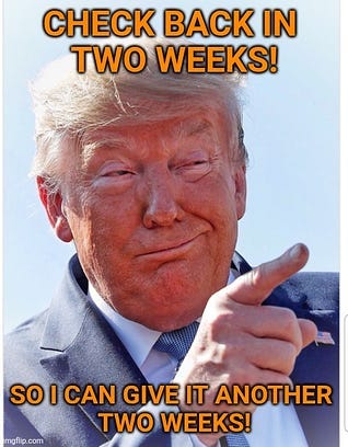 I really enjoyed a recent YouTube podcast clip where Michael Cohen was quite perturbed regarding the constant "two weeks". He said he was going to start keeping track of a subject and check back on it in two weeks for his viewers.