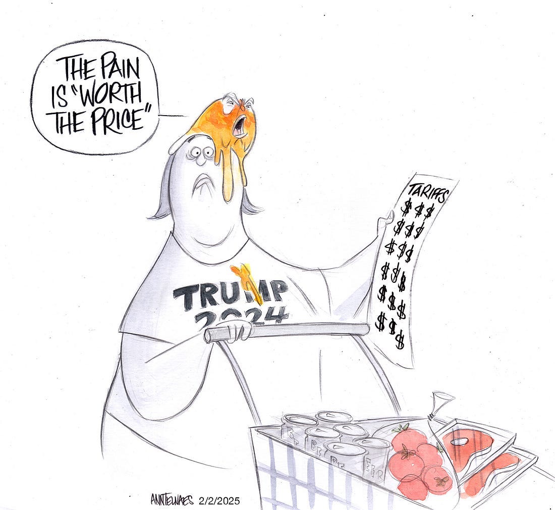 From the Department of Too Late They Start To Get Smart: The reliable University of Michigan Consumer Sentiment Survey shows consumers’ inflation expectations is spiking because of Dilbert’s tariff threats: "About one-third of consumers spontaneously mentioned tariffs, up from 27% last month and less than 2% prior to the election. This is only the fifth time in 14 years we have seen such a large one-month rise in year ahead inflation expectations." Don’t worry folks, your eggs are gone forever, thanks to the bird flu RFK Jr won’t deal with.